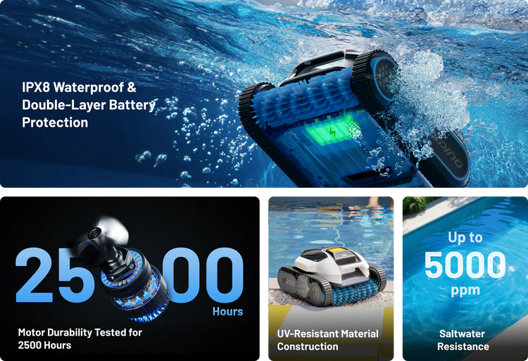 Udstyret med et kraftfuldt 6000 mAh lithiumbatteri, der giver op til 210 minutters driftstid, dækker robotten nemt op til 150 m² og leverer effektiv og pålidelig ydeevne til en pletfri pool.