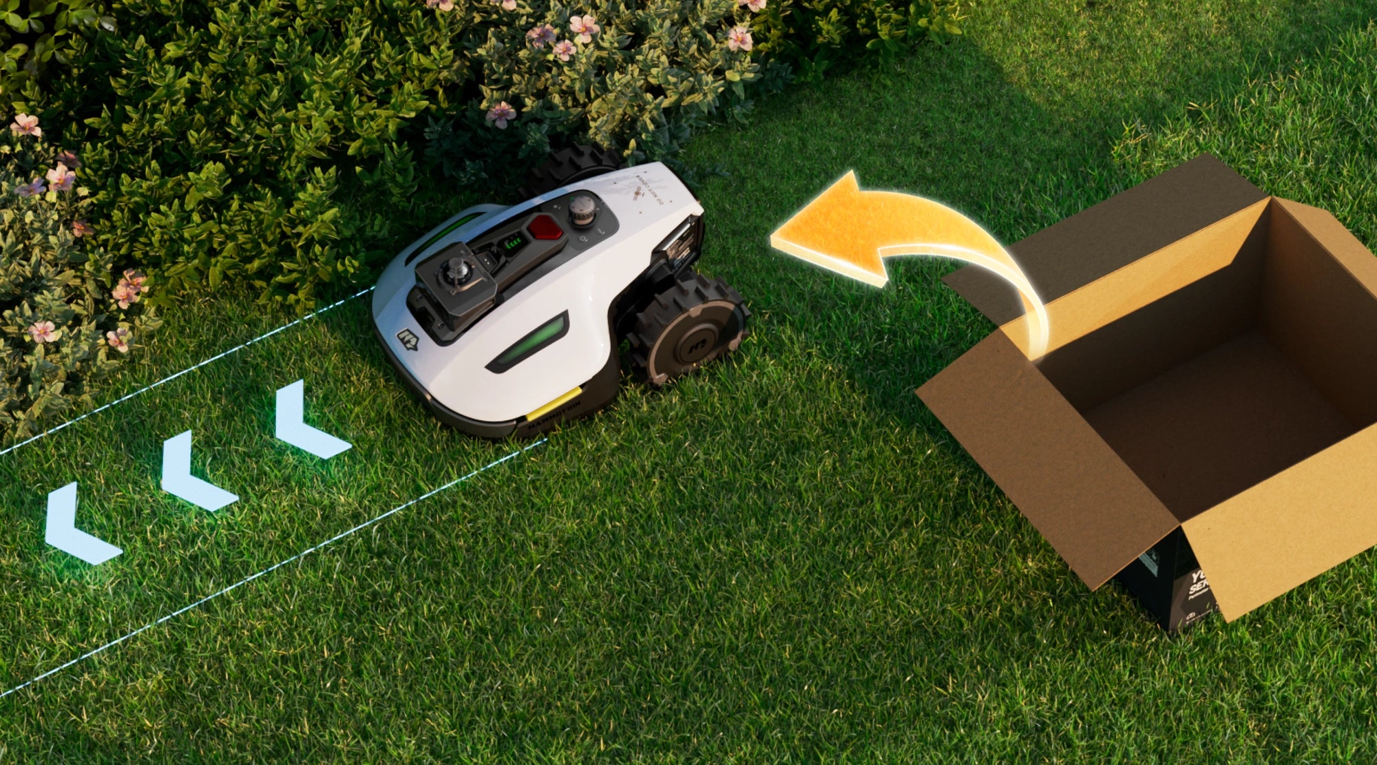 YUKA mini 2 kör ett extra varv längs tomtgränsen och klipper precis över kanten efter dina önskemål och ger en perfekt kantklippning.